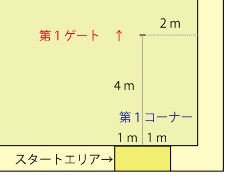 第一ゲートはスタート地点(スタートエリアと呼ばれる幅2mの長方形)から4m離れた位置にあります。4m先のゲートを実際に狙ってみると、かなり狭く遠く感じるでしょう。打者はスタートエリアの内部に置いた自球を打撃し、その球がゲートの内部を通り、球全体がゲート線(ゲートの足の後ろ側を結んだ線)を完全に超えた瞬間をもって第一ゲート通過とします(2015規則)。詳しくは下の図をご覧ください。