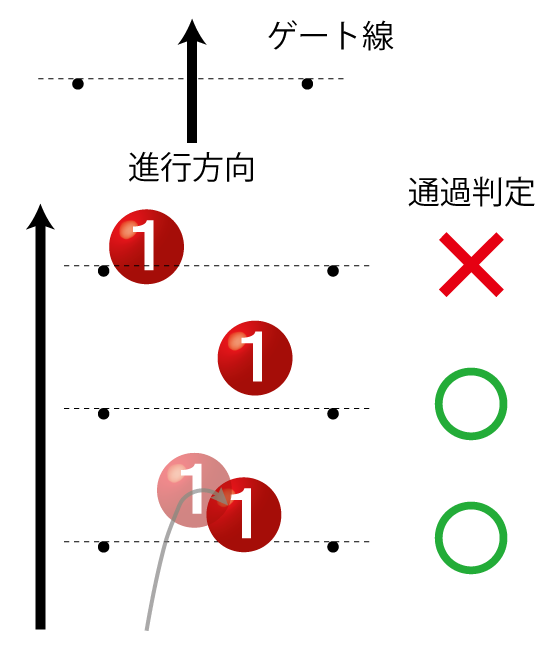 ゲート線の概念:ゲート足の後ろ側(得点になる進行の向きに対して)を結んだ線をゲート線と言い、ボールがゲート線を完全に超えるとゲート通過となる。下の3つの例では、上から順番にゲート線に掛かっているので未通過、ゲート線を完全に越えているので通過、ゲート線を完全に越えてから地形で戻ってきただけなので通過となる。この判定は全ゲートで共通。