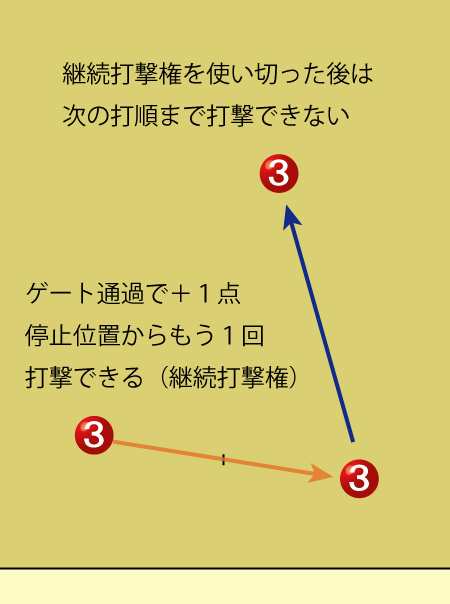 継続打撃権:自球がゲートを通過して1点加算されると、ボーナスとして自球の停止位置からもう一回打撃できる。これを継続打撃権という。