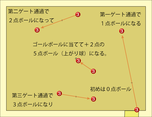 - 3点ボールの状態でゴールポールに当てると上がり球(5点ボール)になり、コートから取り除かれる。