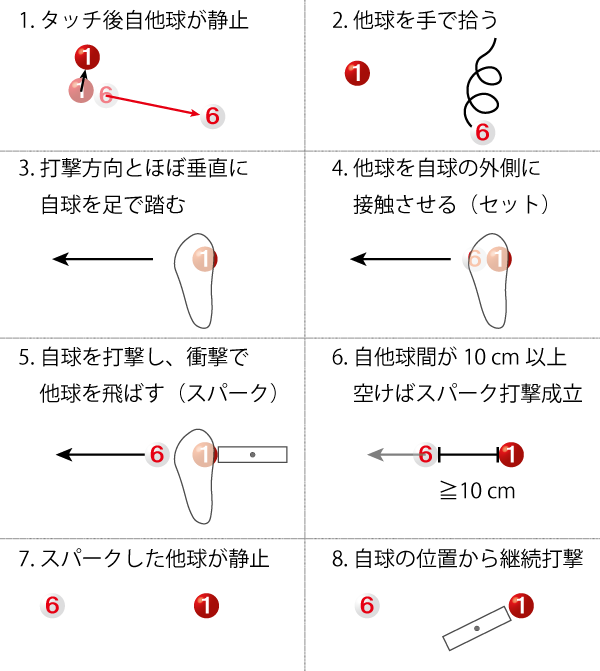 スパークの手順は大変ややこしいので図にまとめておくと、「タッチ成立→タッチした他球を拾う→自球を踏んで他球と接触させる(セット)→自球を打つ衝撃で接触した他球を飛ばす(スパーク打撃)→スパーク打撃成立後、一回の継続打撃権が得られる」となります。