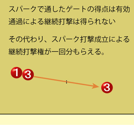 スパークによって生じた、ゲート通過、上がりは全て有効である。他球を通過させても通過による継続打撃権は得られない。スパーク打撃成立による継続打撃権は得られる。この場合、1番が3番を通過させてもさせなくても、スパーク打撃成立による1回の継続打撃権が与えられる。